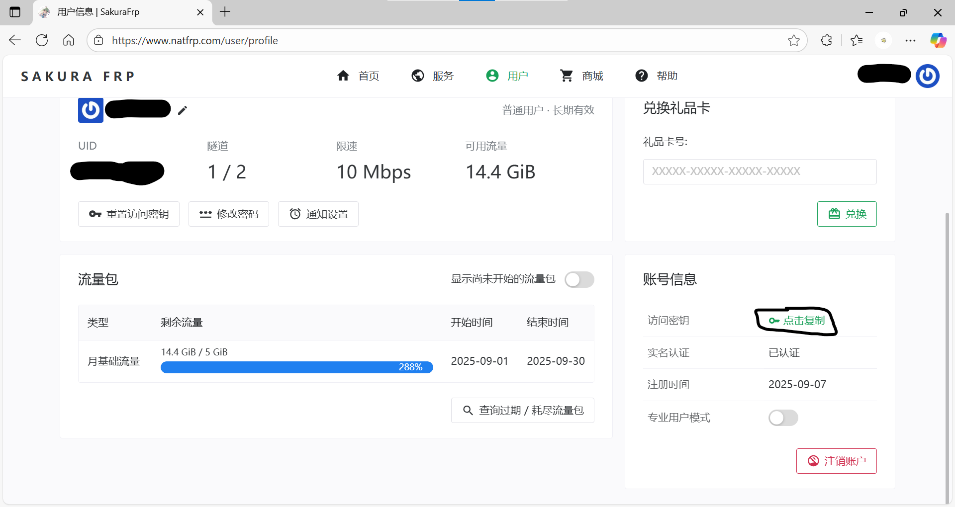 这时回到官网的管理面板,点击用户–个人信息,复制访问密钥,再填入上图启动器中登录