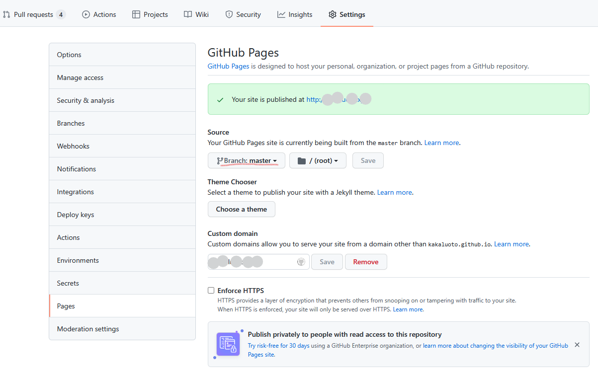 因此,hexo生成的静态博客文件默认放在master分支上。hexo的源文件(部署环境文件)可以都放在source分支上(可以新创建一个source分支)。然后把source分支设置成默认分支。有小伙伴可能会担心默认分支的改变会不会影响到原来的网页的正常显示,其实如果是用GitHub Pages对博客进行托管的话也很简单,第一次搭建博客默认使用master分支作为页面。在下图所示的设置里可以找到。如果不小心搞错了只要把分支设置成静态页面对应的分支就好了。